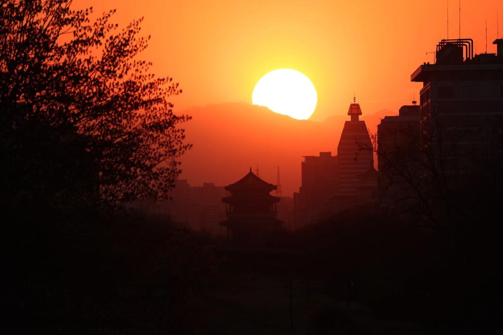 Пекин, 19 марта /Синьхуа/ -- На фото от 18 марта запечатлен закат в Парке руин городской стены династии Мин в Пекине. -0-