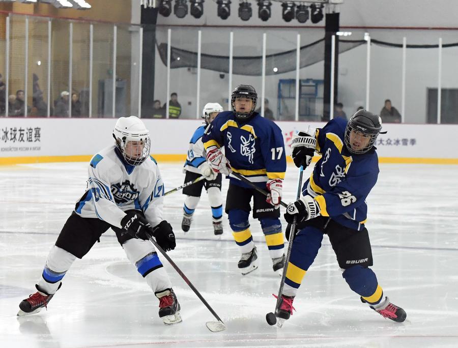 10 декабря 2019 года, китайско-российский юниорский товарищеский турнир по хоккею проходит в городе Тяньцзинь на севере Китая. /Фото: Синьхуа/