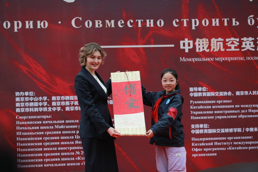 8 апреля 2026 года, китайская школьница передает представителю российской стороны произведение китайской каллиграфии в Нанкинском мемориальном музее летчиков-мучеников антияпонской войны в городе Нанкин провинции Цзянсу /Восточный Китай/. /Фото предоставлено Центром международных культурных связей города Нанкин/