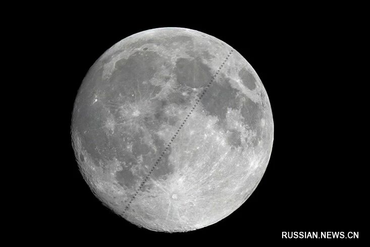 4 ноября 2025 года, на фото запечатлена китайская космическая станция, проходящая перед Луной. /Фото: Синьхуа/