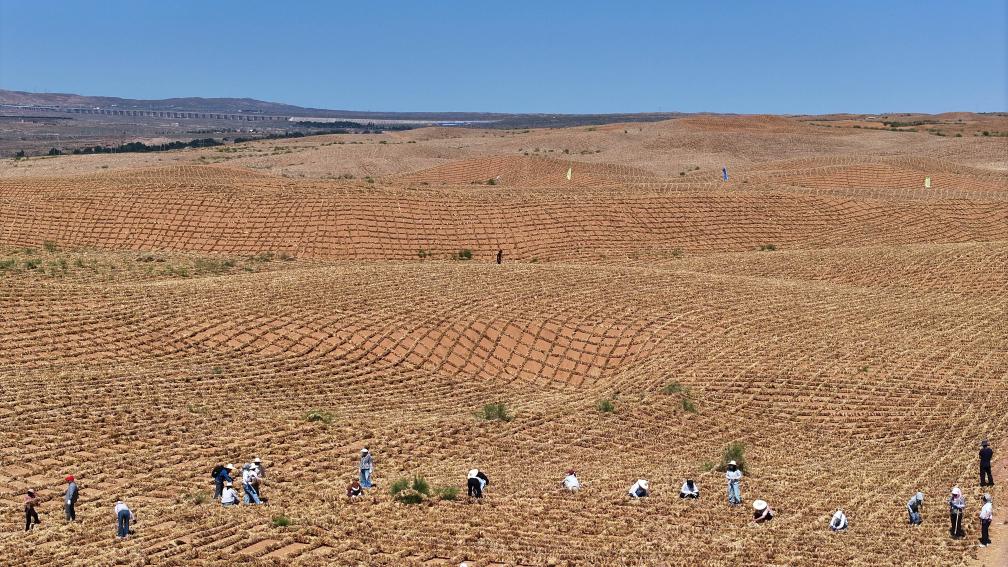 30 июня 2025 года, проект по борьбе с опустыниванием на юго-восточной окраине пустыни Тэнгэр в городе Чжунвэй Нинся-Хуэйского автономного района на северо-западе Китая. /Фото: Синьхуа/