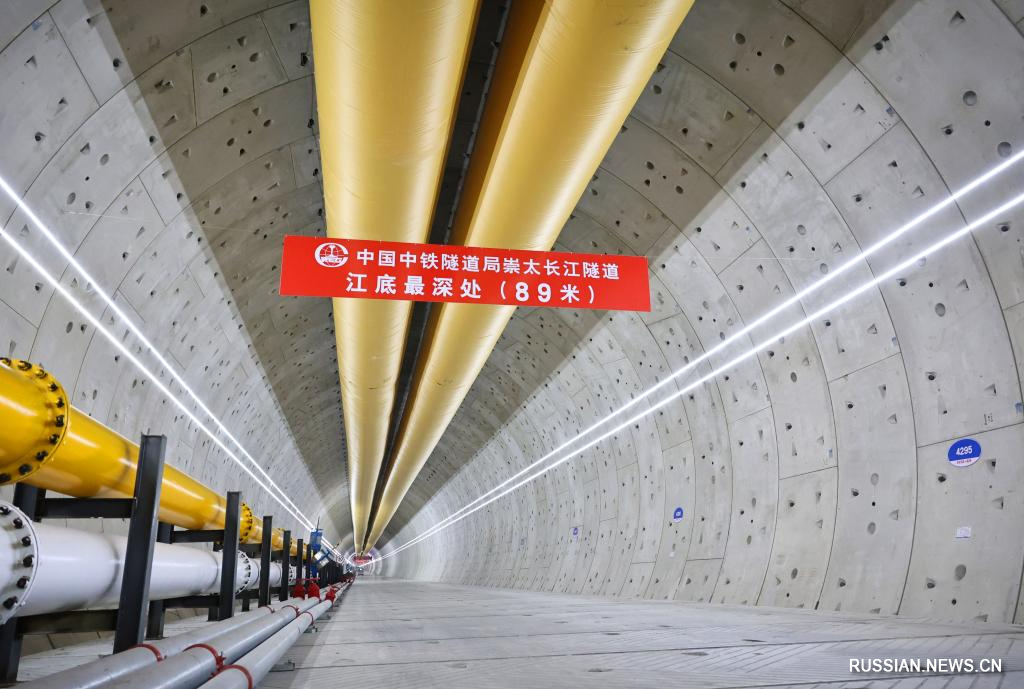 Общая протяженность тоннеля, соединяющего район Чунмин в городе Шанхай и город Тайцан провинции Цзянсу /Восточный Китай/, составляет 14,25 км, в том числе протяженность участка по дну реки Янцзы - 11,18 км.