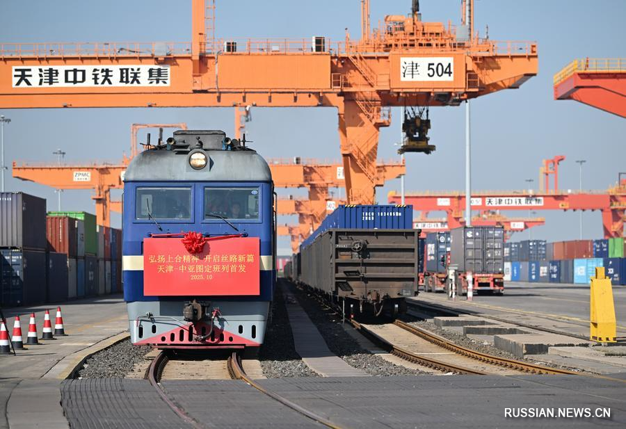13 октября 2025 года, отправление из Тяньцзиня первого грузового поезда, курсирующего в регулярном режиме по ж/д маршруту Тяньцзинь-Центральная Азия с пересечением госграницы через КПП Хоргос. /Фото: Синьхуа/