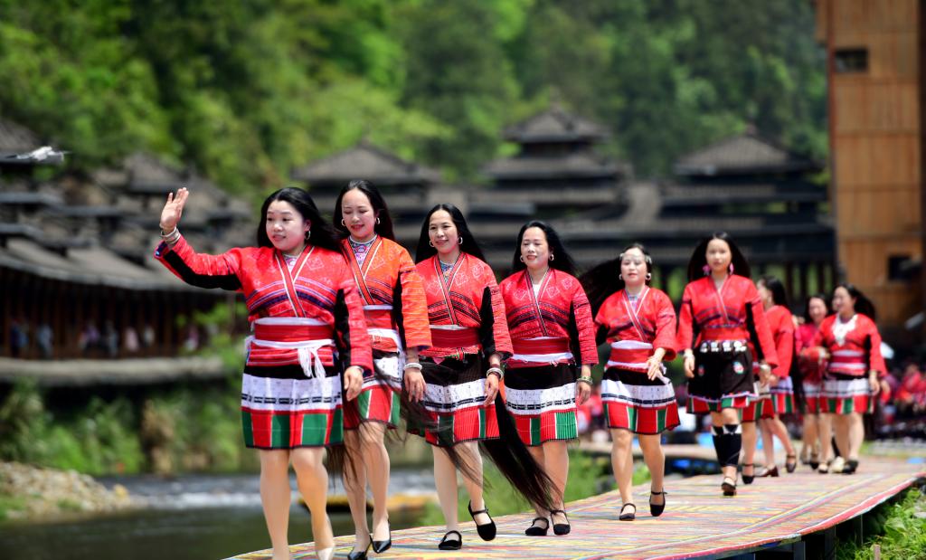 Луншэн /Гуанси-Чжуанский АР/, 20 апреля /Синьхуа/ -- Показ длинных волос, дефиле, песенный диалог и танцы - в числе мероприятий, прошедших по случаю праздника "третье число третьего месяца" по лунному календарю в уезде Луншэн 19 апреля. Фестиваль длинных волос является визитной карточкой местной деревни Хуанло, населенной преимущественно красными яо - частью народа яо. -0-