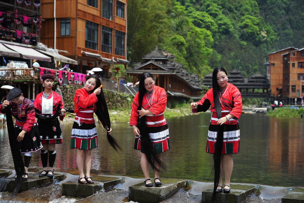 Луншэн /Гуанси-Чжуанский АР/, 20 апреля /Синьхуа/ -- Показ длинных волос, дефиле, песенный диалог и танцы - в числе мероприятий, прошедших по случаю праздника "третье число третьего месяца" по лунному календарю в уезде Луншэн 19 апреля. Фестиваль длинных волос является визитной карточкой местной деревни Хуанло, населенной преимущественно красными яо - частью народа яо. -0-