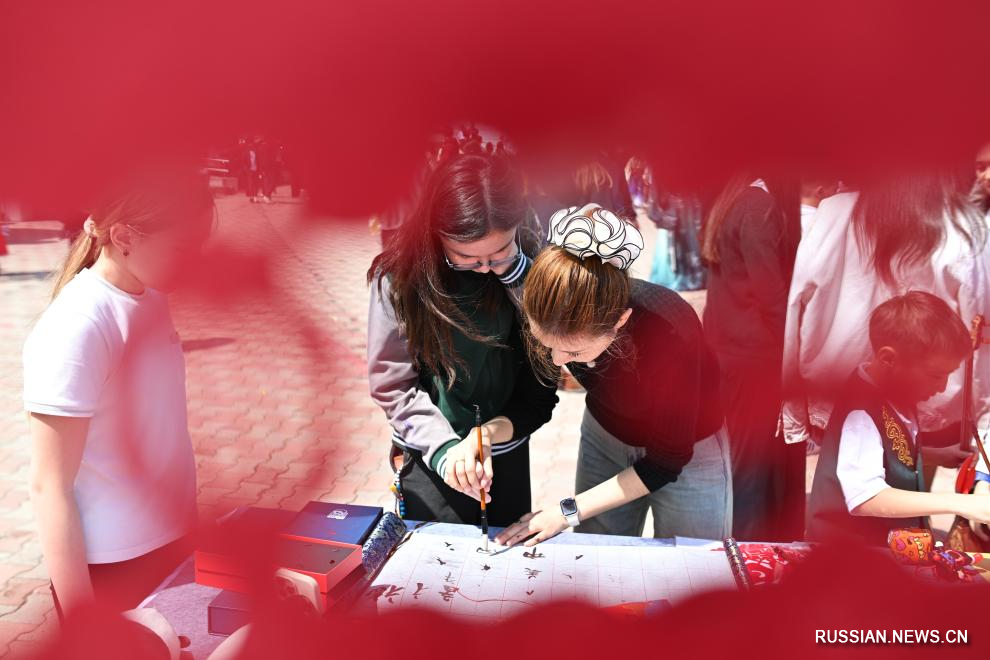 20 апреля, Алматы, Казахстан. На мероприятии по случаю Дня китайского языка ООН преподаватель обучает школьников написанию иероглифов кистью. /Фото: Синьхуа/
