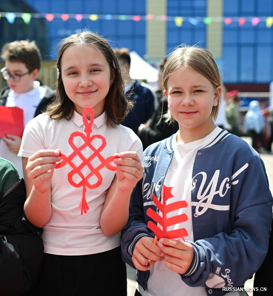 20 апреля, Алматы, Казахстан. На мероприятии по случаю Дня китайского языка ООН школьницы демонстрируют фигуры, вырезанные из бумаги. /Фото: Синьхуа/