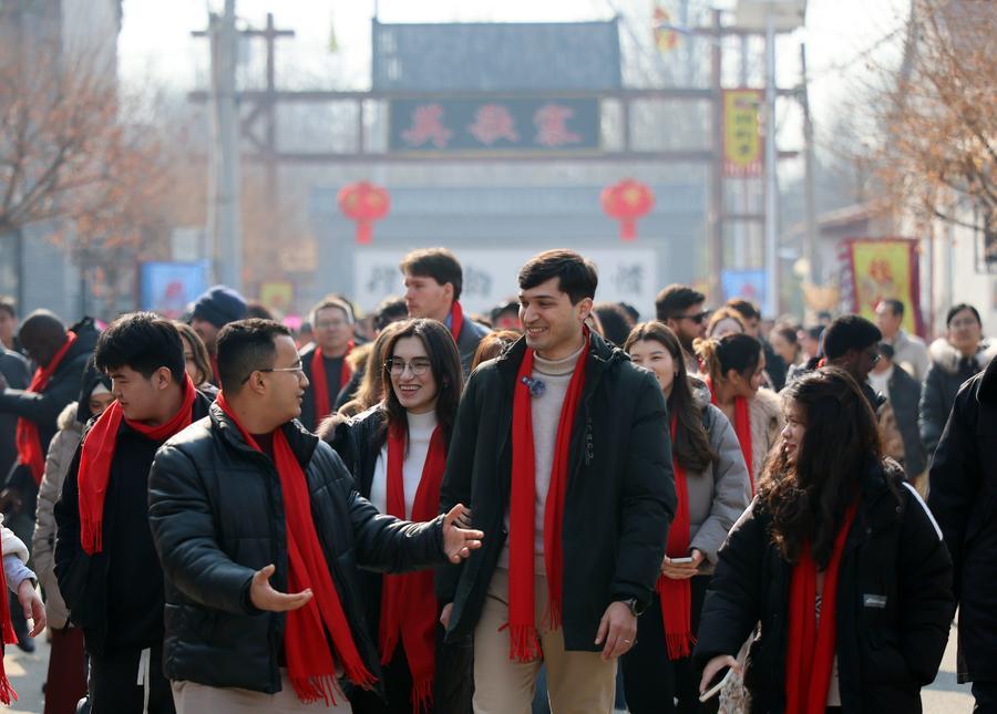 10 февраля 2026 года, студент Умар Сулейманов из Таджикистана /в центре/ и его друзья посещают одну из деревень города Тяньцзинь /Северный Китай/. /Фото: Синьхуа/