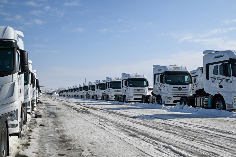 11 марта 2024 года, транспортные средства, предназначенные на экспорт, готовы к транспортировке на КПП Цзимунай Синьцзян-Уйгурского автономного района /Северо-Западный Китай/. /Фото: Синьхуа/