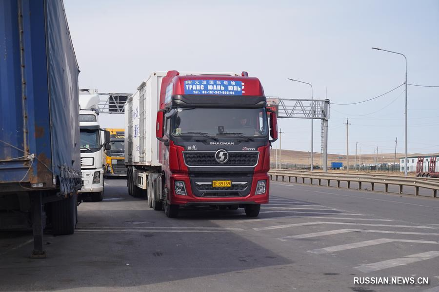 22 апреля, Забайкальск, Россия. Китайские грузовые автомобили ожидают прохождения таможни на российском пункте пропуска Забайкальск для выезда в Китай. /Фото: Синьхуа/